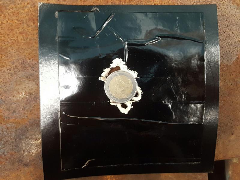 Son 12 disparos, el visor es un bsa de 5-20 x 56, y la diana es una gamo forrada de cinta de embalar y pintada de negro. el punto blanco tiene 20 mm creo (es un parche de tapar dianas de fuego)