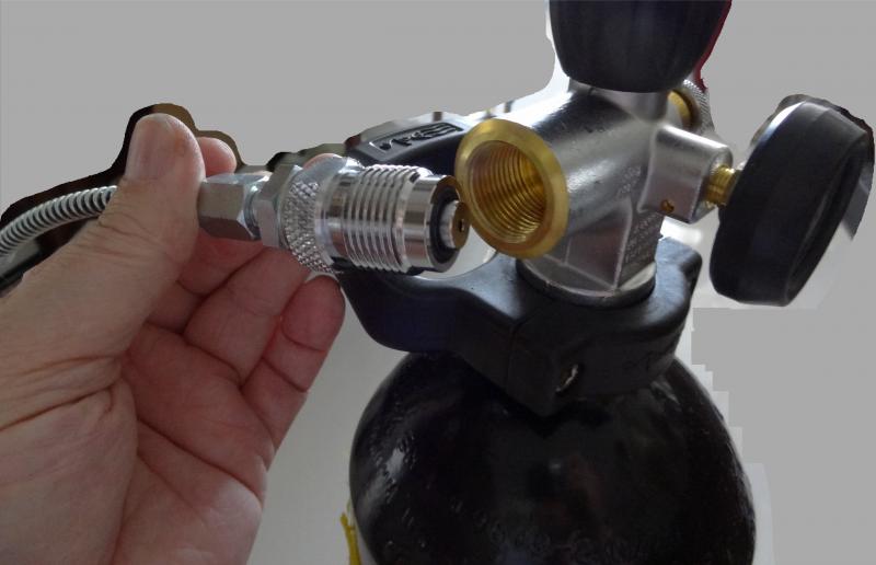 He comprado en Armería Ayala una botella de 7 litros que admite hasta 300 baras de presión. La botella viene completa con su regulador, manómetro y latiguillo para conectar a la carabina.