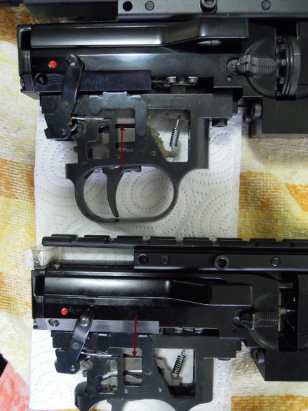 La averia, es la pieza que señala la flecha, llamada Middle Sear, algo asi, como fiador del medio. Esa pieza, esta rota, y el fiador real, el que engancha al martillo, quedandose atras, no toca contra ese saliente, si no, que pasa por encima, y al llevar la palanca de armado hacia adelante, se suelta el martillo.