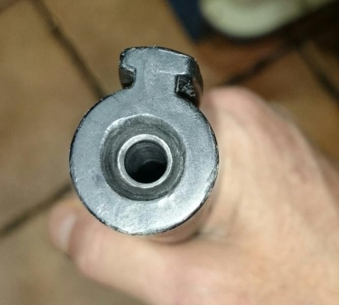 No es lo mejor, pero puede valer: compra una broca avellanadora de 8 o del 5 y con el taladro, procura hacerlo alineado con el cañón. No pasa nada por pasarse un poco pero dejarlo bien centrado. En mi foto, como ves, no es muy perfecto, pero funcionó y mejoró. Luego pásale una brica de pulir para no dejar rebabas.