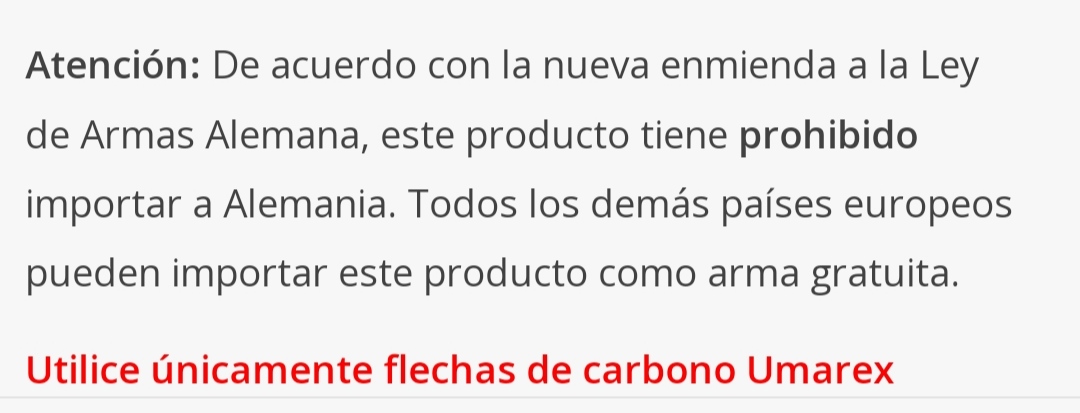 sejos escribió:Lo cierto es que nose si debería de poner este asunto en la sección de armas blancas. Se trata de un rifle de aire comprimido que dispara flechas. Segun el vendedor (y asi lo publica en su web) puede enviarse a España sin problema, pero tengo mis dudas...nose si se clasificaría como ballesta, para la cual haria falta licencia tipo E, o por el contrario al ser de aire comprimido no... La web en cuestión es "tactical24eu".