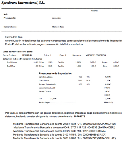 amigo colindres, perdona que he estado fuera y no he podido hacer tu seguimiento, manda webs, al final te trincharon estos cabrones de speedtrans, eso es mas ilegal... habia que ponerse en contacto con alguna sociedad de consumidores y que te expliquen; por que si tu pagas un articulo en estados unidos y te lo tienen que traer hasta la puerta de tu casa, haber que narices hacen estos mendrugos cobrandote despues esas tasas manda narices, el lado bueno es que aunque te hayas gastado un poco mas de lo previsto si sale mas barato que los atracos que meten en España por este tipo de cosas, que debemos ser los mas tontos y caros de europa. un saludo.