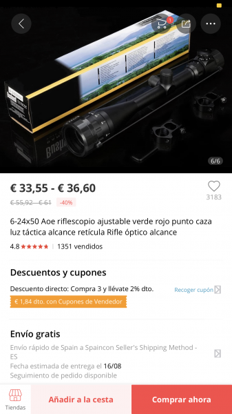 En visores o bien los pides por Aliexpress y tarda un mes, en Amazon y Ebay unos +-15 días o a armería física 24-48h, un chino remarcado de marca por 4 o cinco veces el precio de los chinos de aliexpress