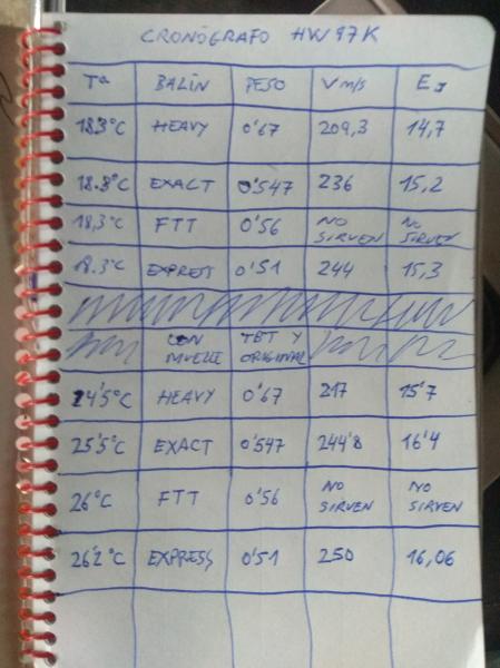 Hoy he estado haciendo unas pruebas de balines con mi hw97k y he cronografiado. Curiosamente, los resultados obtenidos me han sorprendido porque lo que comenta el compañero de la poca diferencia de potencia independientemente del balín utilizado en este caso he podido ver que así ha sido....