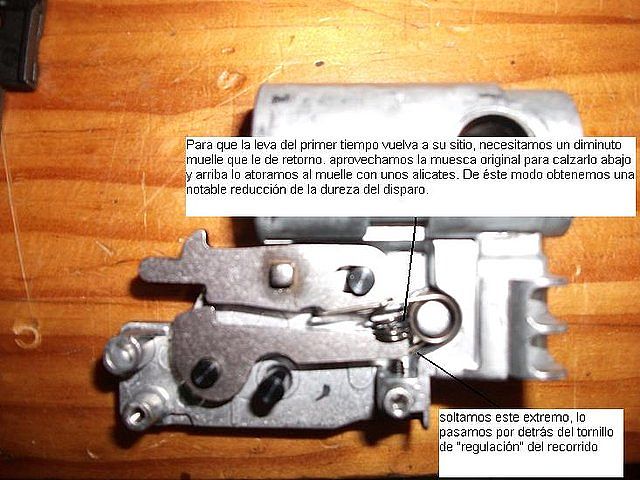 En la 2ª foto se aprecia el muelle que hay encima del tornillo que debería regular el recorrido de los tiempos pero no hace nada, se trata de quitar la grupilla del pasador que hace de eje del gatillo, no hace falta sacar el pasador del todo, si quieres y colocar otro muelle casero mas blando. Respecto al tornillo que creo que es de metrica 2,5 es buscar uno un pelin mas largo para que realmente actue, si se coloca uno demasiado largo puede ocurrir lo que expliqué en el mensaje anterior, no pasa nada si no se aprieta demasiado pero si te pasas de profundidad puedes tener algún problema.