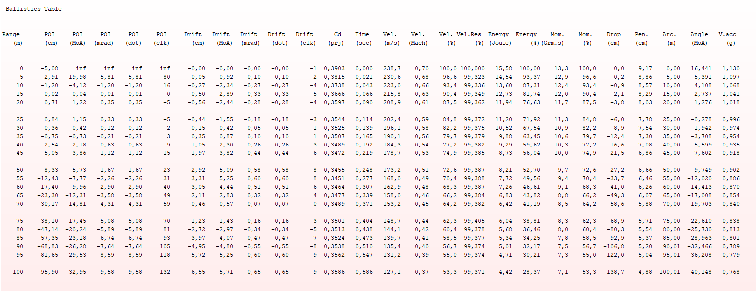 En cualquier caso, nuestras fórmulas están bien. De hecho, en la tabla que has adjuntado, salen los cálculos exactos si consideras el balín con un peso de 0,55 gramos, un poco más de 0,5, como tú bien dices.