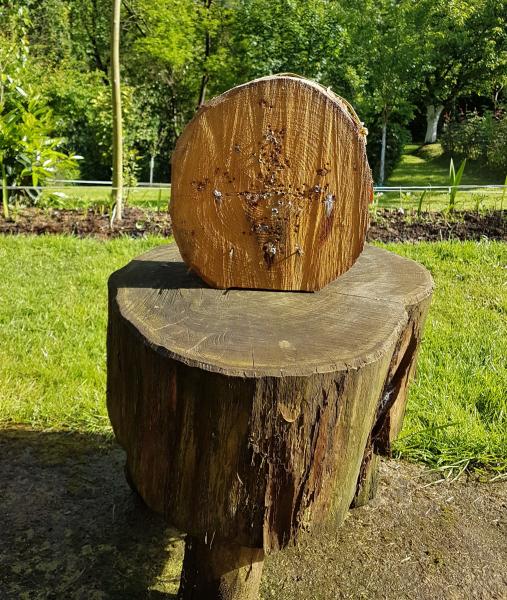 Un buen tacón de madera, en mi caso de encina con unos tornillos para sujetar las dianas.