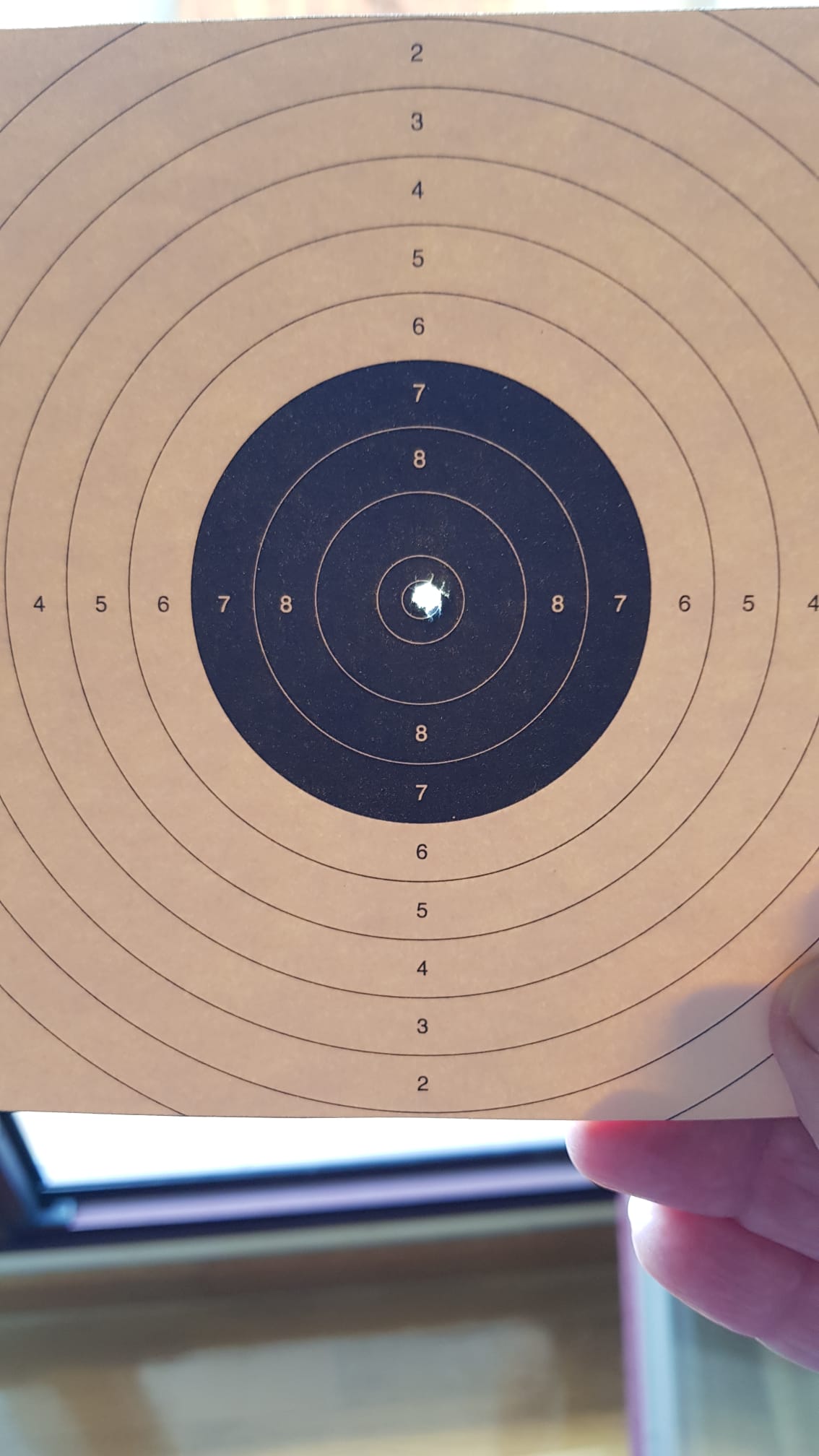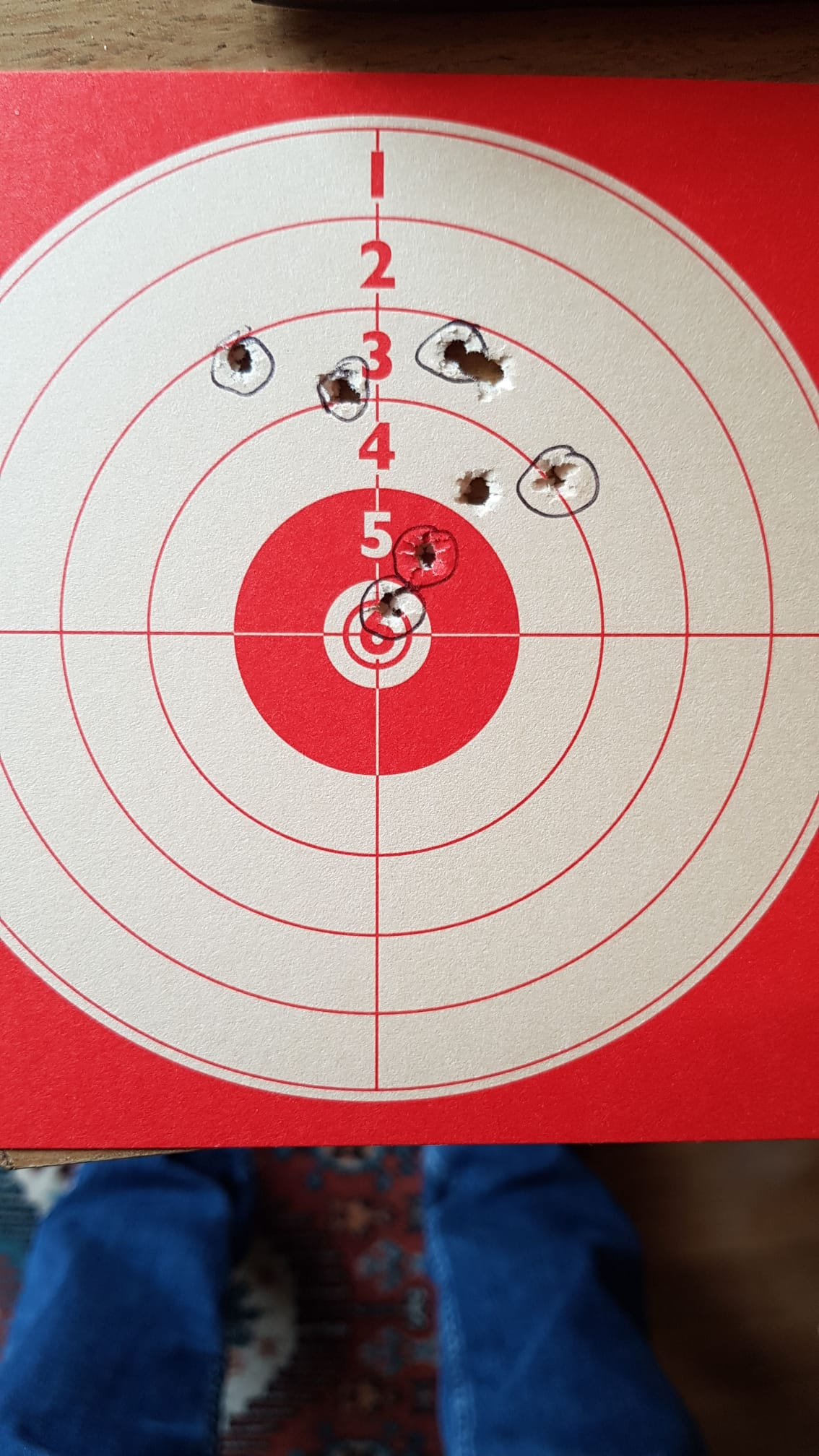 Empiezo a.disparar y lo primero que observo es que a pesar de dar bajo y a la.derecha " 5cm. a la derecha y unos 8 abajo" los pactos van uno tras otro casi al mismo agujero" apenas milímetros de diferencia, y ya van 5"