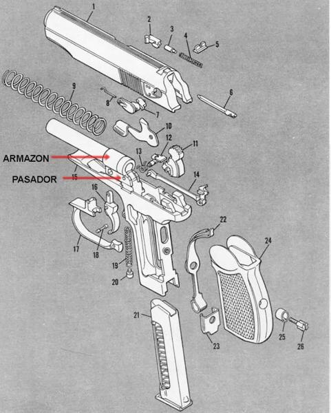 Las cachas, aparentemente, son las originales, como el disparador, su biela, el fiador, el reten de corredera. Todo lo demás, esta modificado.
