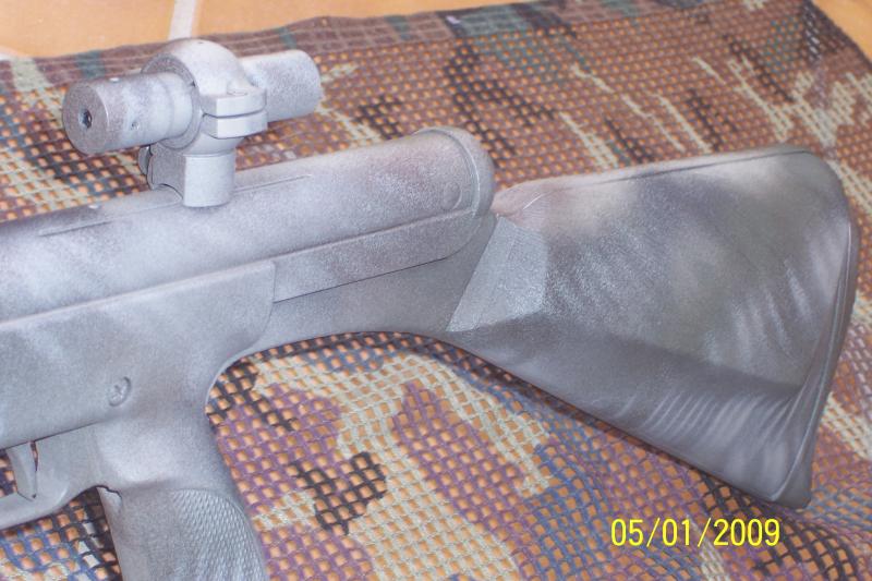He cortado unos 2cm de la parte trasera del cuerpo de la carabina, he tenido que realizar una pieza para empalmar la empuñadura original rémington, también se ha modificado la empuñadura para poder acoplarla.