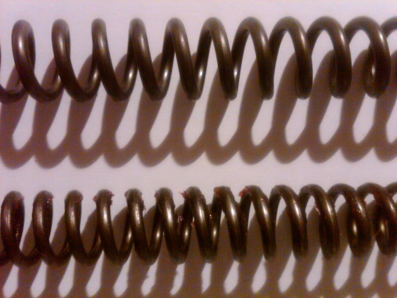 La segunda foto muestra cláramente la diferencia de grosor y calidad de los aceros. El de arriba es el muelle Hatsan. Un acero mucho más pulido, cilíndrico completamente y más grueso. El de abajo no llega a ser cilíndrico del todo, es algo achatado, y la calidad -obviad la grasa-, no parece tan buena a simple vista.