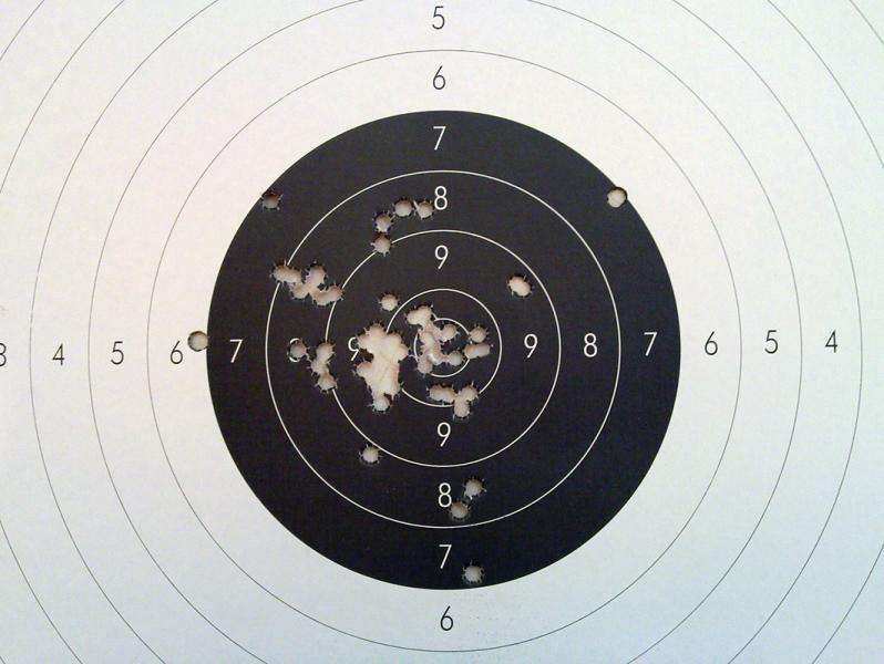 Mi ultima intervención en este post, va a ser colgar la foto de la diana de la Bull, a 50 m, hecha por los compis, con visor y un banco de tiro (menos mal)....la mia, a mano alzada con una pistola de verdad, de 1200 g de peso, a la mitad de distancia, es un colador....Juzguen ustedes mismos....La cantidad de dieces conseguidos, abrumadora....