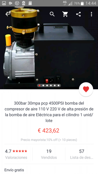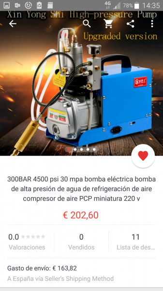 Como te decía el colega Antoneau yo tengo ese compresor comprado en Ayala desde hace unos meses. Resumiendo, una maravilla. Olvídate de buscar donde recargar la scuba y de pedir favores o hacer KM. Solo necesitas un enchufe y un cubo de agua. Eso si, no cargues botellas con el. Es un compresor pequeñito diseñado para cargar el depósito de la carabina, función que cumple a la perfección. Yo tengo ahora mismo una Vulkan del cal. 6,35 que cargo a 250 Bar. y con el compresor la lleno en cosa de un minuto y medio o dos minutos.