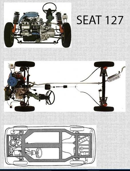 El Seat 127, era un pequeño utilitario de los años 80, de 2 volúmenes, que digamos, vino a cubrir el segmento del SEAT 600, más moderno en concepción, DE TRACCION DELANTERA, de 52 CV el modelo más potente, con motor montado de forma transversal al sentido de la marcha, unido a su caja de cambios, diferencial y transmisión a las ruedas delanteras, todo esto, metido dentro del vano motor, y debajo del capot delantero………….Y ojo, la caja de cambios, iba situada delante, y a la izquierda del conductor, y el conductor accionaba las marchas desde el puesto de conducción, con un varillaje hasta la caja de cambios, como en todos los modelos de coche tracción delantera.