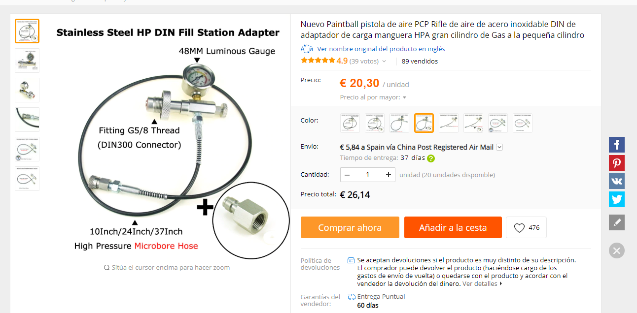 Donde pone color, escoger la cuarta opción, empezando por la izquierda, la de 24 pulgadas (60 cm de largo), que deberían de llegar, con el conector Foster hembra (muy importante), y ahí, es donde enroscas el pin de carga que te viene con la carabina.....