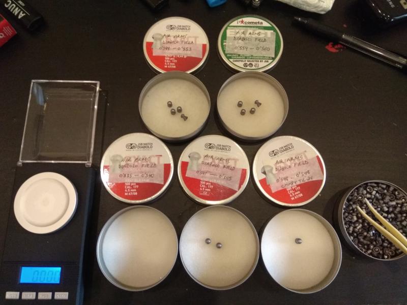 Bueno, es que para hacer 7 u 8 grupos de balines entre 0,535 y 0,560 g, como hace el compañero, los grupos tienen que estar en un margen de (0,560-0,535)/8 = 0,003 g,.... y por tanto, sí que resulta necesario pesar y medir, y sobre todo garantizar la milésima en la medida.