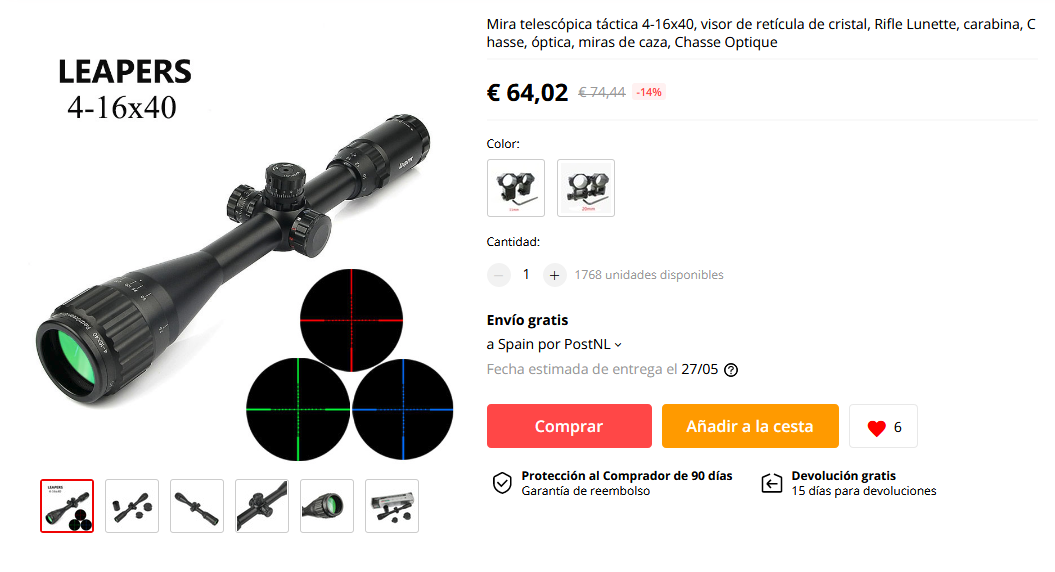 Gracias por los aportes!! Me ha molado ese leapers, he tenido el 3-9x40 normal sin paralaje y me ha ido muy bien, pero aquí en España cuesta unos 90 pavos... He visto "el mismo" leapers 3-9x40 con paralelaje frontal y retículo iluminado en Aliexpress por unos 50 pavetes... De ser el mismo, tiene que ir muy bien para latear sin pretensiones. Hay alguna diferencia entre estos del Aliexpress y los que venden en tiendas online españolas?? Saludos!!
