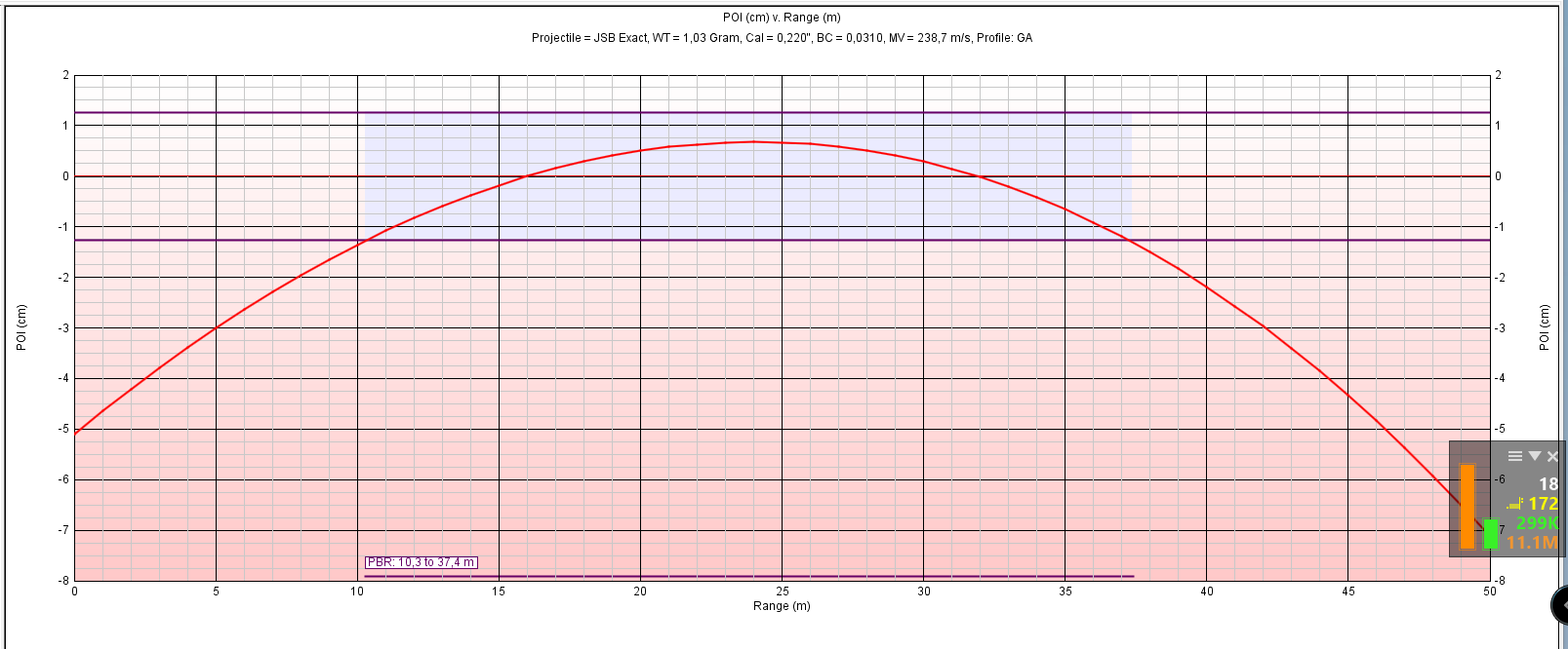 En la grafica, la cruz de la retícula, seria la línea marrón entre las dos azules (el CERO del visor), y veríamos, que la cruz de la retícula, nos vale igual para 16 m y pico, como para 30 m y pico. Todo esto, depende del balin, peso, calibre, y su velocidad, claro esta.....![]()