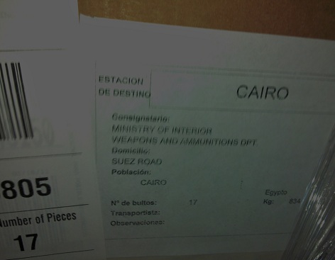 En la etiqueta se lee destino El Cairo, "Consignatario"....Ministerio del Interior, Departamento de armas y Municiones.