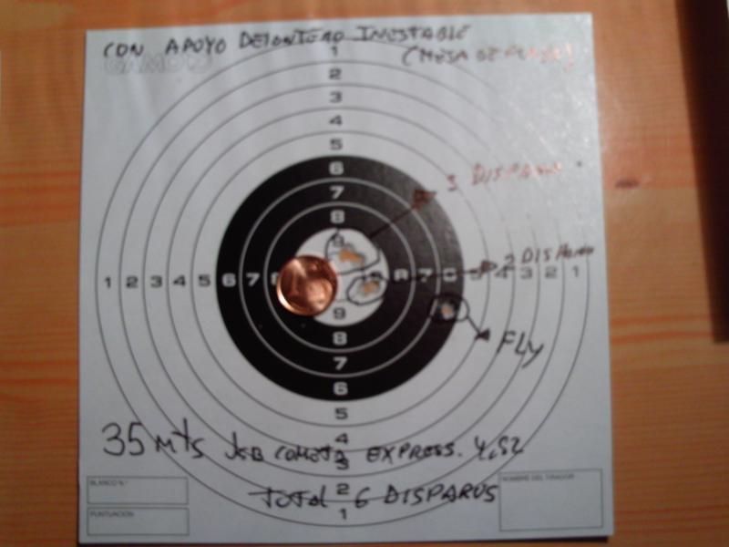 Hola , como algunos compañeros me han mostrado interes por esta carabina y yo he comprado una , a la vez que existe cierta desinformacion de ella , pues esta mañana hice unas dianitas a 25 y 35 mts , son la distancia maximas de las que disponia . El apoyo cutre salchichero ( una mesa de playa ) y encima un par de guias de telefono y un buen diccionario , todo eso combinado con lo malo que soy yo pues ha salido esto que os muestro . Me consta que esta carabina en manos de un tirador mas experto en pcp deberia de hacer grupos todavia mas cerrados , yo soy de piston de toda la vida , eso se nota en el fly que hay en la diana de 35 mts , la falta de costumbre . Da gusto tirar con pcp aunque mis resorteras se quedaran conmigo para siempre ( por lo menos la Diana 28 ).Un saludo.