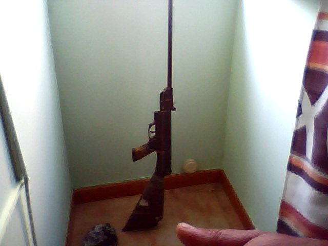 El otro dia dando una vuelta por el foro, me encontre con este hilo y me llamó mucho la atención, ya que gracias a una imagen del catalogo las carabinas gamo de los años 75 que subio nuestro compañero Ignacio-L , pude reconocer la carabina que compró mi abuelo ya por esa época o antes, es la gamo mod 68 me parece, correjirme si me equivoco, yo me inicie con esta de niño hace unos 20 años, hasta que ahorre y me compre una norica mod.56 que me costó 9500 ptas, en fin no os aburro mas, loque queria era dar las gracias por estas imagenes, aqui os dejo la fiera, que aún esta al pie del cañon, un poco rebentada de maderas, pero lo sorprendente que aún tira.