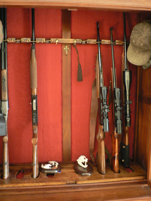 A tus carabinas no les va a pasar nada por dejarlas apoyadas contra la pared, no se van a doblar. Pero desde luego no es el mejor modo de guardarlas. Se pueden caer fácilmente y dañarse. Los maletines rígidos están bien para guardarlas (mejor en posición horizontal y sobre la parte ancha del maletín) y transportarlas, mucho mejor que las fundas de tela y espuma. Si lo que quieres es tenerlas en un rincón de casa de forma vertical puedes hacerte con cuatro tablas y un poco de maña un armero casero, de forma que queden bien aseguradas y no puedan caerse y golpearse. Te pongo unas imágenes de algunos hechos por compañeros para que te hagas una idea de lo que digo. El acabado final dependerá de lo exigente y curioso que seas. A los diseños de las imágenes primera y última habría que ponerles unos pestillos como los que llevan en la imagen segunda para asegurar las carabinas, de forma que no puedan caerse accidentalmente.