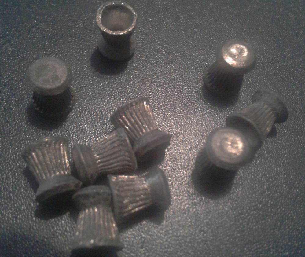 Por la pinta parecen los match de gamo, de ese tipo, de cabeza plana en distancias cortas suelen ir bien, pero ya en mas distancias.... x eso de ser planos pierden eficacia. Lo que si se mira es que estan muy "blancos" eso es oxido de plomo, ahi si que habria que labarlos