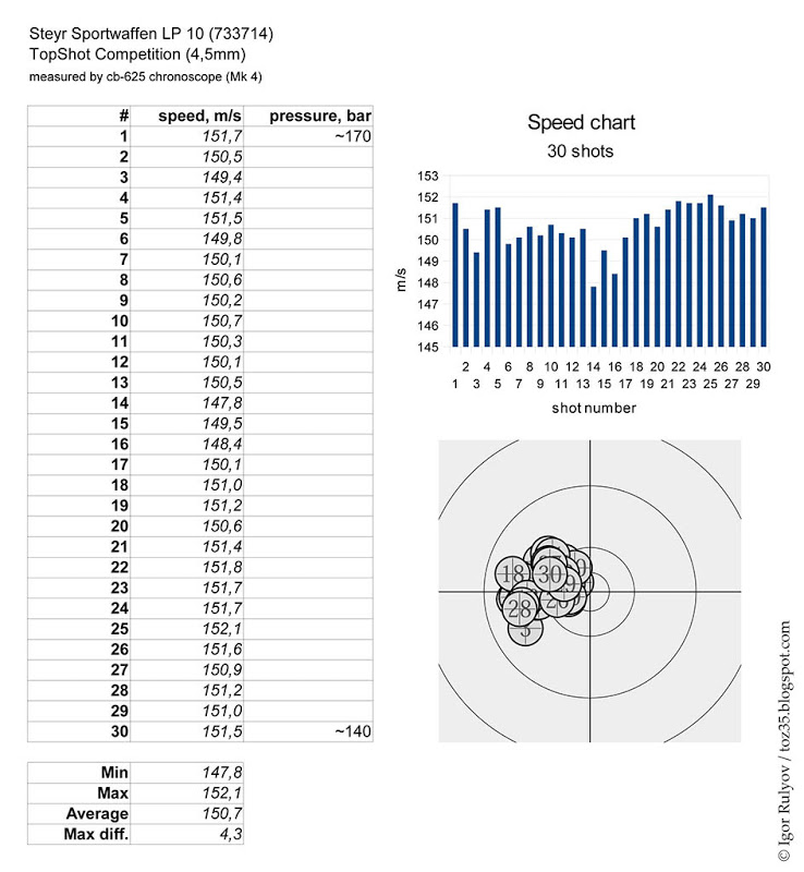Normalmente la velocidad de salida de una pistola PCP de competición es de unos 150 metros por segundo, pudiendo ser algo mayor o menor. El que la velocidad de salida del balín sea unos metros más o menos alta es algo que no es para nada determinante. Lo que interesa es que, sea cual sea la velocidad de salida, esta sea lo más uniforme posible. La variación en una pistola de aire de calidad, como pueden ser por ejemplo las Steyr, va a ser de unos pocos metros por segundo.
