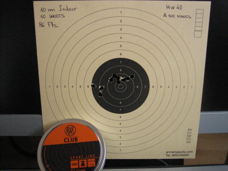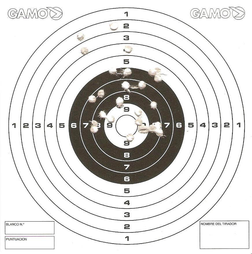 Estas dianas están hechas con una Drulov lov-21 adquirida hace unos días para ir practicando el coger las miras y mecanizar el proceso de apuntado mientras espero que me llegue la licencia F (entregué la documentación el pasado martes en la Intervención de Armas así que todavía tengo una larga espera por delante). Todas las dianas están hechas con munición gamo match que viene en cajitas de cartón (era la más barata que tenían en la armería donde compré la munición) a 10 metros en interior, concretamente en las instalaciones para tiro neumático del Club de Tiro de Trasona (Asturias), y a una mano.