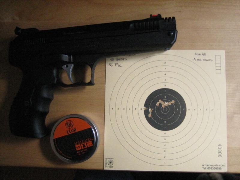 La pistola, aunque de apariencia y acabado pueda parecer un tanto tosca, es muy precisa como se puede observar una vez puesta a tiro (me costó algo ponerla a tiro porque tuve que desarmar el alza ya que de la casa venía muy descorregida y ni con los tornillos de regulación del alza al máximo podía corregir lo que necesitaba el punto de impacto).