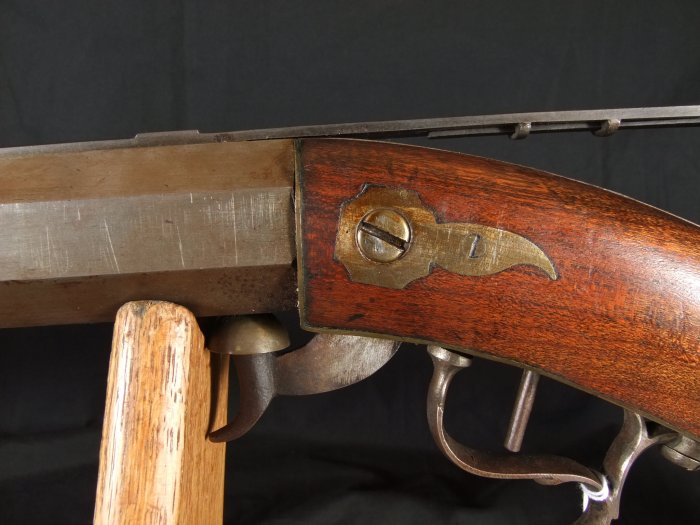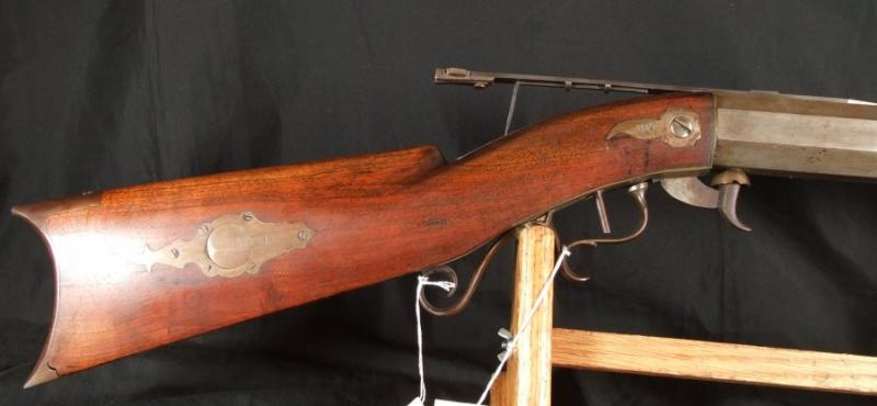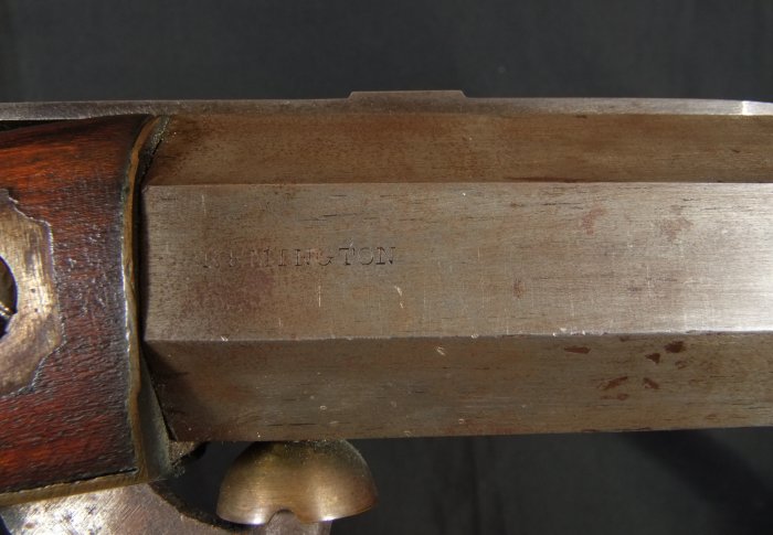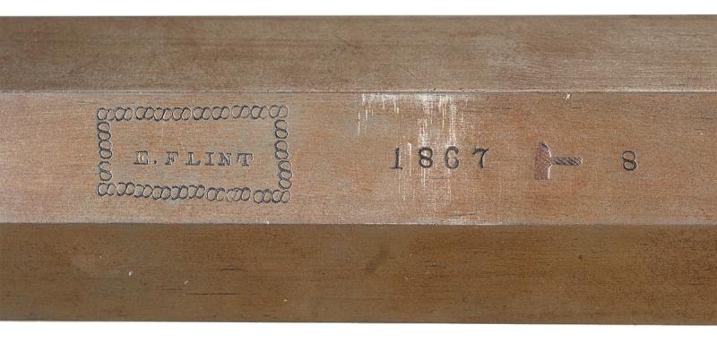 Historical Flint M-1867, Extra Heavy Barrel Target Rifle. Description: The top of the barrel is marked \"E. FLINT\" followed by \"1867 (an image of a hammer) 8\". The right flat at the breech is stamped \"REMINGTON\", so the barrel was made by Remington and the gun assembled by FLINT. It features a turned muzzle for a bullet starter, with a globe and pin front sight and an adjustable bar peep sight, there is no provision for a ramrod. The stock has an iron scroll target type trigger guard, toe plate, side plates, cap box and crescent buttplate with a nickel silver inlay of a squirrel on the left buttstock. The consignor believes that this rifle was produced by D.H. Hilliard and has found reference to a Captain E.A. Flint as serving with a Massachusetts cavalry unit who had an outstanding record in U.S. Civil War. Condition: Very good. The barrel and mounts are \"in the white\", with the barrel turning slightly brown and the corners on the flats are still sharp. The rest of the iron mounts show a little more smooth patina. The otherwise fine stock has possibly been lightly cleaned, with very few handling marks. Mechanically fine. The gun is big, and weights 22 pounds by my bathroom scale. It is one heavy dude. It has real near tang rear sight, it flips up and has a pinhole to sight through. It is not fit for a false muzzle. It is .45 caliber with an excellent bright bore.