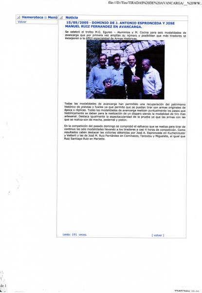 a 50 m el maxi de la izquierda (yo recalibro a 451) y 30 gr de 3F (Suiza nº 2). La bala la empujo con un iniciador unos 10 cm adentro y luego con la baqueta y un calepino de bayeta amarilla de los chinos que cita indignado. Esta forma de proceder consigue dos cosas: al entrar el proyectil la suciedad cae sobre la sémola y sale con el siguiente disparo, y ahorra tiempo (muy necesario para los 13 disparos en media hora). Si limpias despues de hacer el disparo, antes de introducir la nueva carga de pólvora, depositas la suciedad del disparo anterior en el fondo de la recámara.