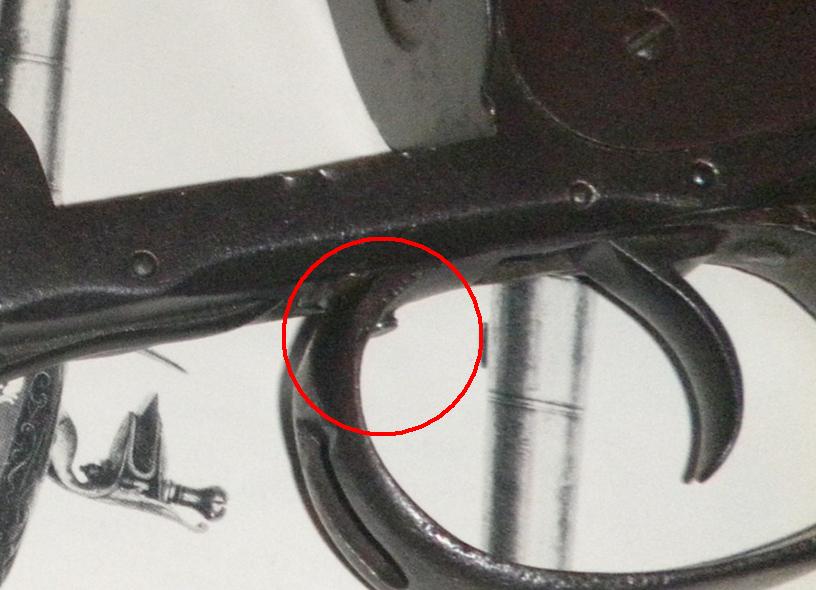 Tal vez sea ese el sentido del orificio del guardamontes, pero lo cierto es que las imágenes que encuentro de revólveres similares a este y con culatín, siempre tienen este accesorios sujeto por la parte posterior de la culata, lo que me hace dudar de que esta sea la función del agujerito.