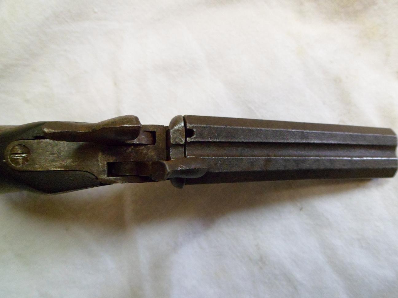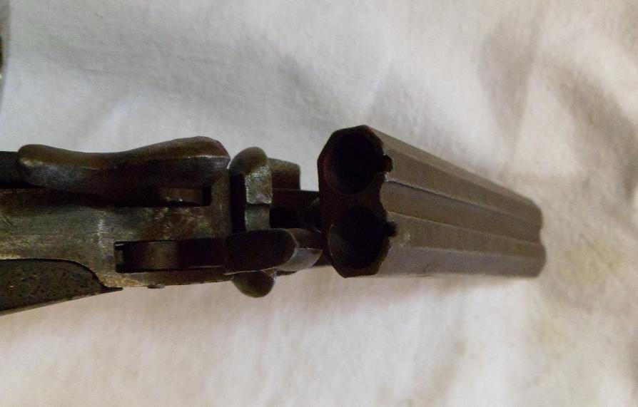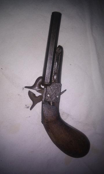 Así, a ojo, mi apuesta sería por una pistola de dos cañones de retrocarga, de sistema Lefaucheaux (alias "cartuchos de espiga"). Creo que en el siglo XIX las solían llevar los viajeros, comerciantes ambulantes, tratantes de ganado...