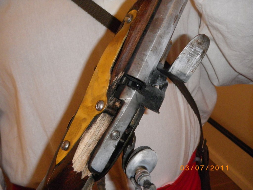 COMO BIEN DICE , mi amigo jeremiah, es un mosquete mod. 1757 de ARAL, " NO ES DEL ROJO ", efectivamente ese dia se estaba disparando con una carga de 80 grains , bola cal.69 y sin calepino , el motivo de este destrozo ¿¿?? , pienso que una mala calidad en materiales o en fabricacion , alli se hablo de fatiga en el acero, pero lo que si que es cierto es que este mosquete en concreto habria hecho en su vida no mas de 100 disparos con bola , si mas de 1000 ,pero solo con polvora ,en recreaccion ,solo salvas.