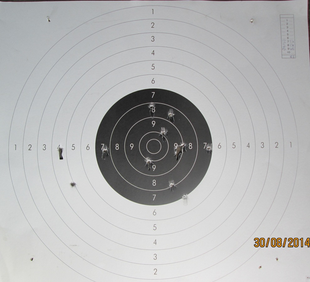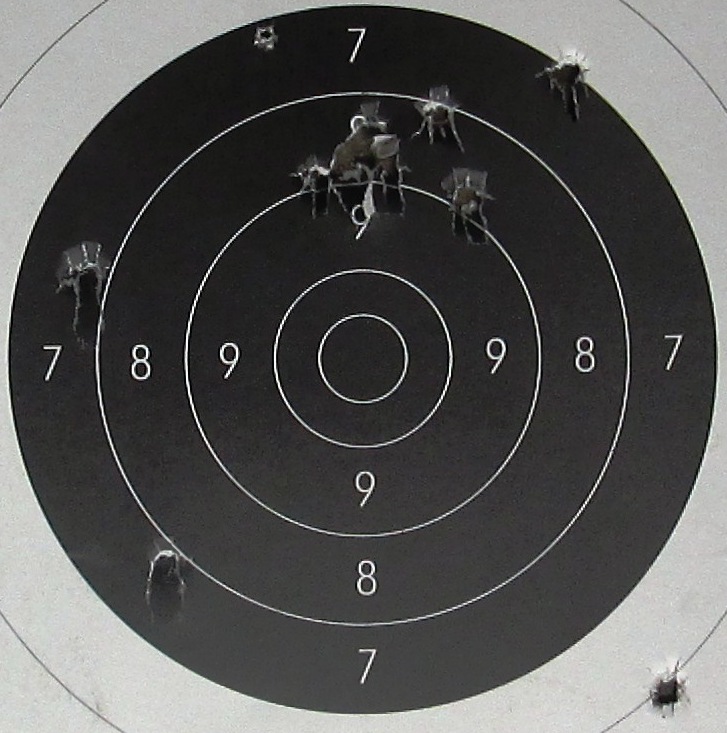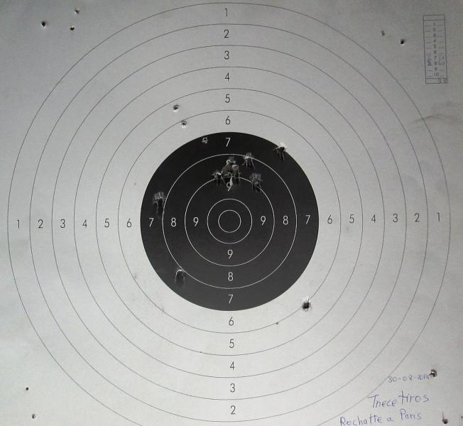 Esta mañana he estado tirando con la pistola (rochatte) a una diana reciclada los trece tiros de rigor y cuando he querido contar la puntuacion me he encontrado que habia seis tiros sueltos y un pegote en el que se supone hay los siete restantes (nunca tiro fuera del papel) ¿En un caso asi como se demuestra que los tiros han ido alli si no se aprecia en el papel ?. La segunda diana esta mas en la linea que suelo hacer y se puede contar bien, solo hay un pegote de tres tiros en el nueve pero mirando bien se aprecian.