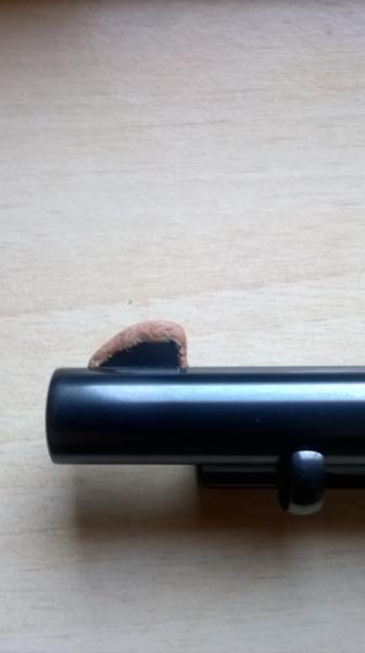 Tiro bajo: Limar el punto de mira (parte superior del poste), con sumo cuidado y de poco en poco. Proteger el cañon con cinta en la zona próxima al poste por si la lima se escapa accidentalmente ...