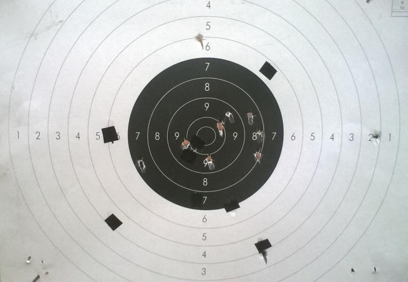 Hoy he podido tirar un par de dianas pues llovia y no podia trabajar, la visibilidad era mala. Aunque no sea buen tirador con pìstola se notan los tiros desfasados o erraticos. En una de las dianas recicladas hay trece tiros, diez en la zona negra un seis y un 4-5a la derecha que es por donde tengo tendencia a desviarme. Esto es normal para mi, pero el cuatro a la izquierda no se como ha ido a para alli, es un tiro desfasado. En la otra hay diez tiros y estan todos por ahi menos uno que se ha ido al dos, me he quedado de piedra cuando lo he visto, para mi habia sido un tiro correcto, Un tiro erratico. Tiro apuntando al centro de la diana y con polvora 4ffff.