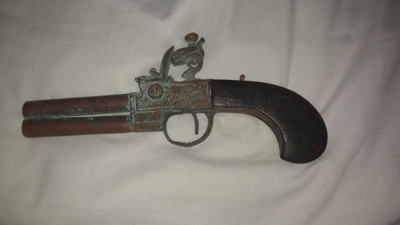 Buenas, hoy traigo una vieja arma de la cual no se nada. Segun lo que e encontrado es una pistola inglesa, de finales del siglo XVII y principios del XIX. Por lo que veo es una pistola con dos cañones superpuestos de avancarga.