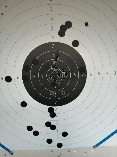 Hoy por fin he podido ir al campo de tiro, no he tenido mucho tiempo, he probado con 12 grains de pólvora, 18 de semola y proyectil de 435(es el que he podido encontrar), y la verdad que estoy muy contento, el 4 ha sido el primer tiro, se me ha escapado el tiro por el dichoso pelo,