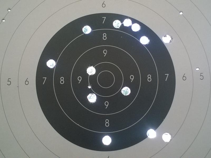 He estado tirando hoy con el pursuit xlt de ardesa del calibre .50 de 28" de cañon, un arma creada para la caza y para ser usado con sabots y bala subcalibrada. El sabot para caza como se tira poco se puede aguantar pero para tiro recreativo que te hinchas a tirar sale caro y hay veces que no los encuentras en el mercado. Yo le doy un uso recreativo y tiro con el diferentes proyectiles que fundo. Hoy he usado proyectiles minie de una turquesa LEE de paredes rectas que parece un perdigon de vaso a lo grande, con la peculariedad que no son de plomo puro sino de plomo aleado, una mezcla de plomo recuperdado de la zona de dianas, bastante duro por cierto. Creo que el resultado de la tirada a cien metros es bastante satisfactoria teniendo en cuenta estas circunstancias. Apoyando el fusil por delante, miras abiertas y a cien metros.