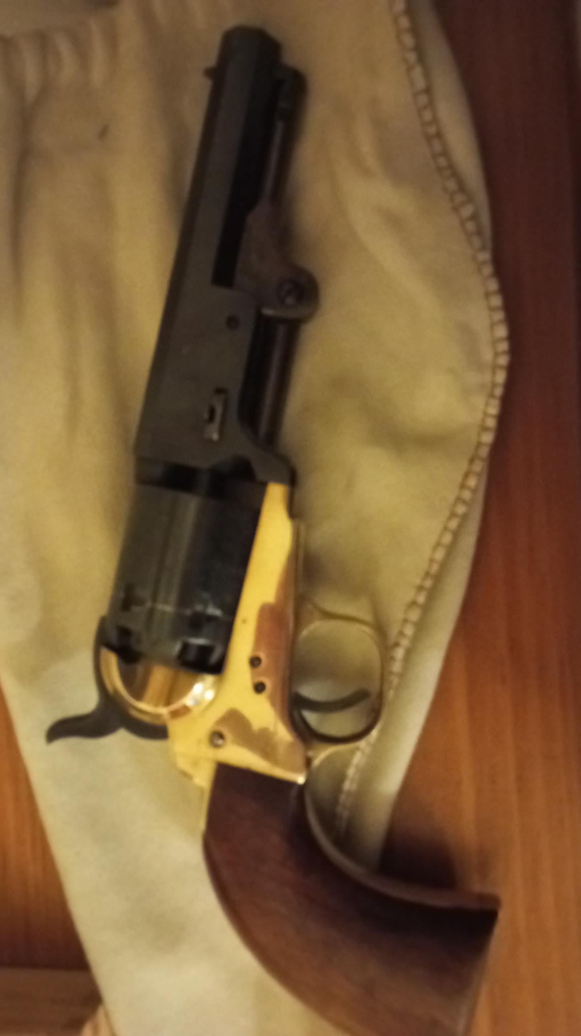 Saludos, a ver si alguien me puede ayudar en la carga de pólvora para un revólver San Marco, modelo Colt Navy en calibre .36 y cañón de 5 pulgadas. La pólvora de la que dispongo, es la suiza nº 2 y bola RG del calibre .375. Adjunto fotos de la pólvora y el revólver.