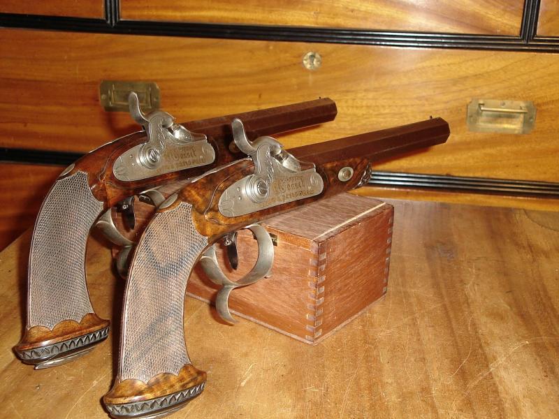 Este juego de pistolas de duelo es un excelente ejemplo de un trabajo bien realizado, cañones en acero Damasquino, que no Damasquinado; Octogonales de 23Cm. Con un diámetro de 22mm. Ánima estriada de 12mm. Fabricados en Lieja seguramente para un encargo especial, Pistolete en madera de raiz bellamente trabajada, caja y guardamontes burilados, gatillo a pelo. Estuche igualmente en madera de raiz con todos sus complementos