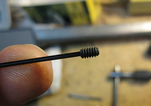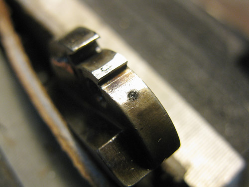 En primer lugar se punzona el punto exacto para realizar el agujero roscado, en el que entrará el tornillo allen para que regulando éste, podamos hacer que el recorrido del disparador varíe. Esto es útil, cuando tenemos un mecanismo con excesivo arrastre. Una vez hemos dejado el tornillo a la altura apropiada, lo sellamos con algún componente, como puede ser laca de uñas, para evitar que se mueva y pueda variar el recorrido.