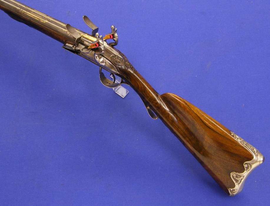 Puees bueno ... un arma francesa de doble cañon y doble llave de silex por Hubert Le Clerc de Paris hacia 1.770 con los aparejos montados en fina plata labrada. Calibre de 14 mm. y un largo de 125 cm. Como es norma de esta casa, en muy buenas condiciones.