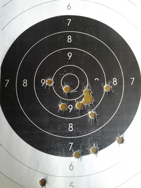 Esta es la agrupacion que os comentaba.Si le meto un poco mas de polvora no toma la estria y se abre esa agrupacion incluso fuera del negro.Me han comentado compañeros aqui en Bilbao que pruebe con 2F,pero para el arma que es creo que no puedo pedirle mas.Algun dia llegara el Watlander.