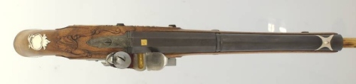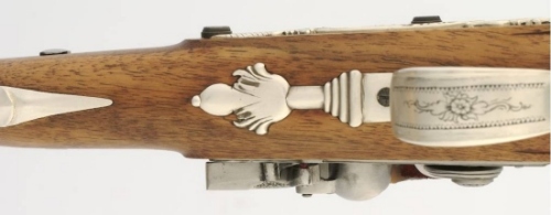 - Las exposiciones lado de la mejilla audaz, pero sus lÃneas fluidas, acentuado con relieves evolución del frente y detrás del lomo redondeado. Además, están los adornos una "ébano y marfil" estrellas en la mejilla, un escudo de plata cincelada y pulgar una copiosa cantidad de incrustaciones de hilo de plata graciosa.