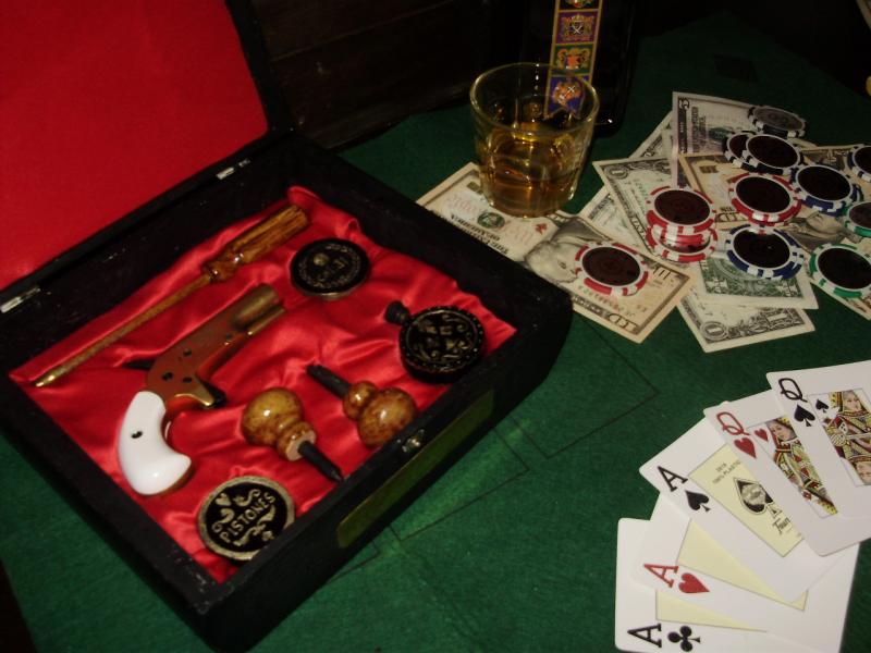 La base es una caja de puros (Palmeros, los mejores), luego la polvorera y las cajas de pistones y bolas, pues son cajitas metálicas de pistones CCI. La baqueta esta hecha con un listocillo de madera un mango de destornillador y un casquillo del .25ACP. El Destornillador es una punta intercambiable de los chinos, y la llave de chimenea es una barra de acero recortada, ambos con tiradores de gavetas. Vamos, reciclaje puro y duro.