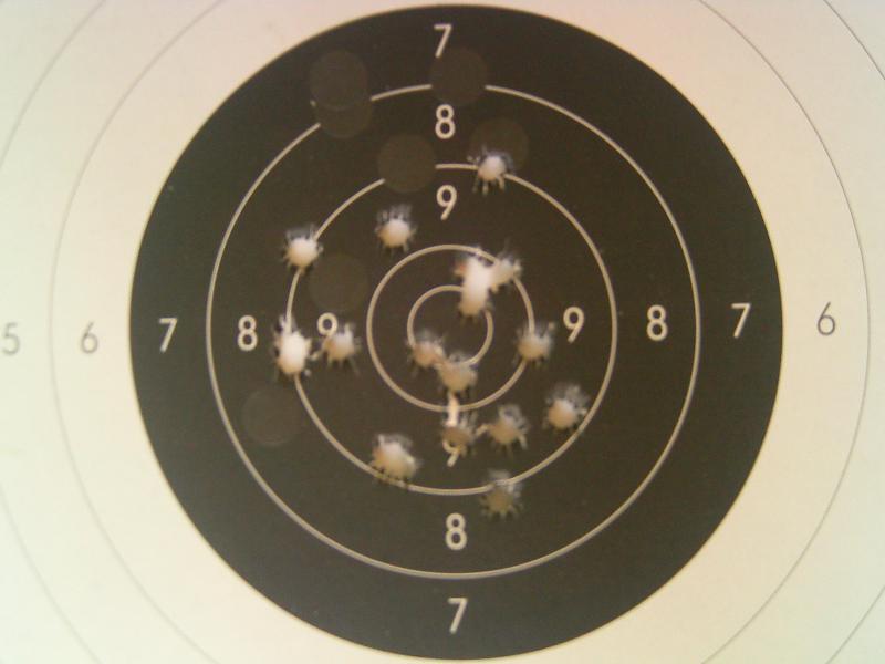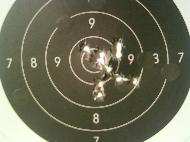 No ha habido tiros raros (el día tampoco era el mejor pues había bastante viento) y la agrupación es algo abierta aunque responde a dos ajustes de diópter distintos (he subido un poco al ver que se me quedaban muchos tiros en el nueve)
