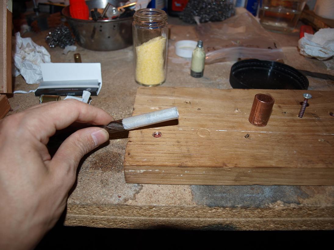 Ponemos el papel en un trozo de tubo de cobre con la medida de altura cortada a 1.1 y rellenamos con la medida de sémola. Ponemos un disco de cartón sacado de una caja de munición con un cartucho del 9 afilado a modo de sacabocados. Apretamos el conjunto con una broca un poco mas fina.